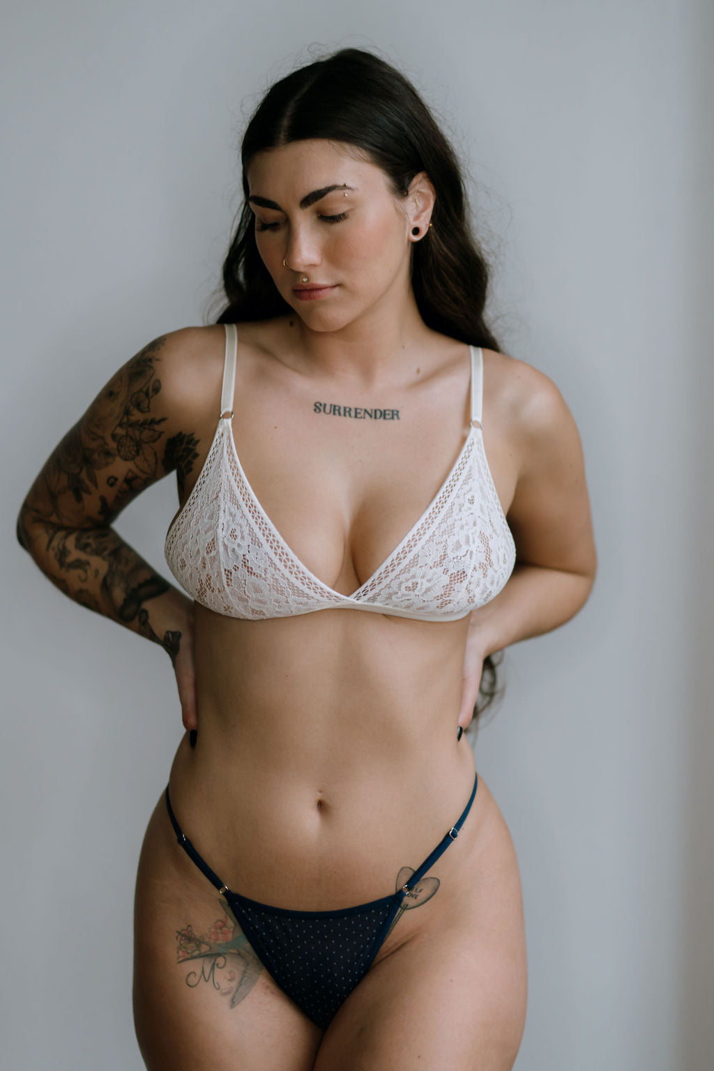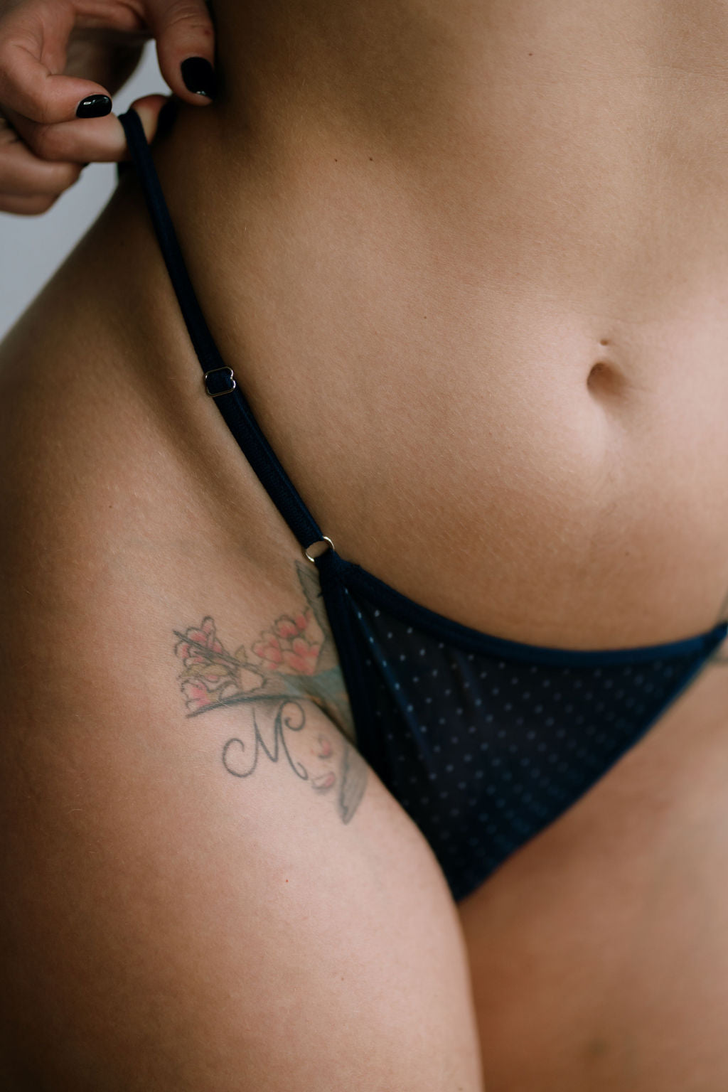 - A deep navy lace duo with seductive straps and midnight flair.